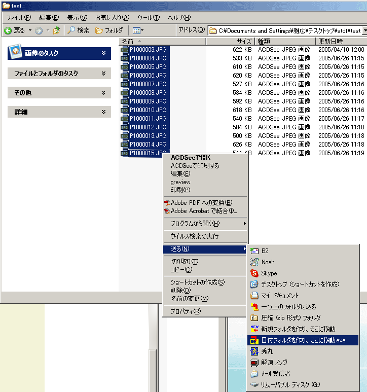 1) 移動させたいファイル達を選択して、[右クリック]→[送る]→[日付フォルダを作り、そこに移動]