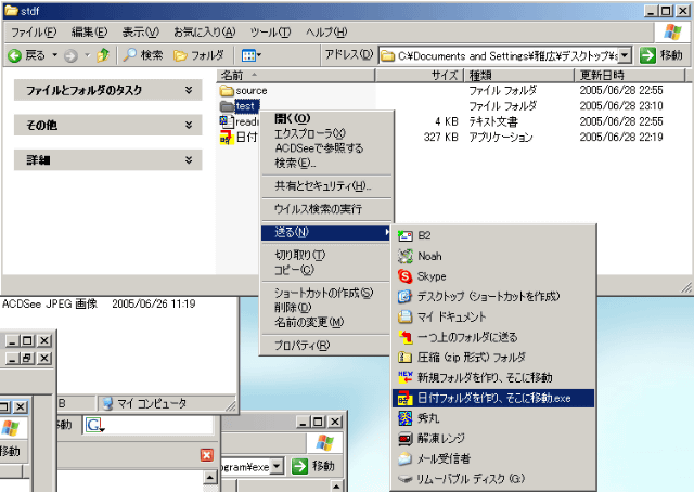 手順1:[マイコンピュータ]から、[ローカルディスク(C:)]に移って下さい。そこで次に、[Documents and Settings]フォルダを開いて下さい。そこで、貴方のユーザ名のフォルダを開いて下さい。薄い色のフォルダで、[SendTo]が有るのがお解りになりますか?そのフォルダを開いて下さい。開いたら、そこに解凍して出来た、[日付フォルダを作り、そこに移動.exe]をコピーして下さい。 - [普通の人向け]