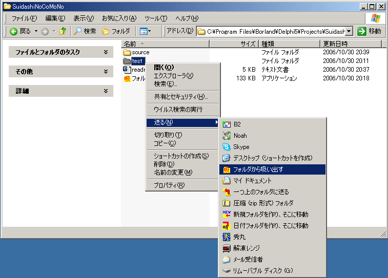 吸い出したいフォルダを[右クリック]→[送る]→[フォルダから吸い出す.exe](ショートカットでも可)を選択。